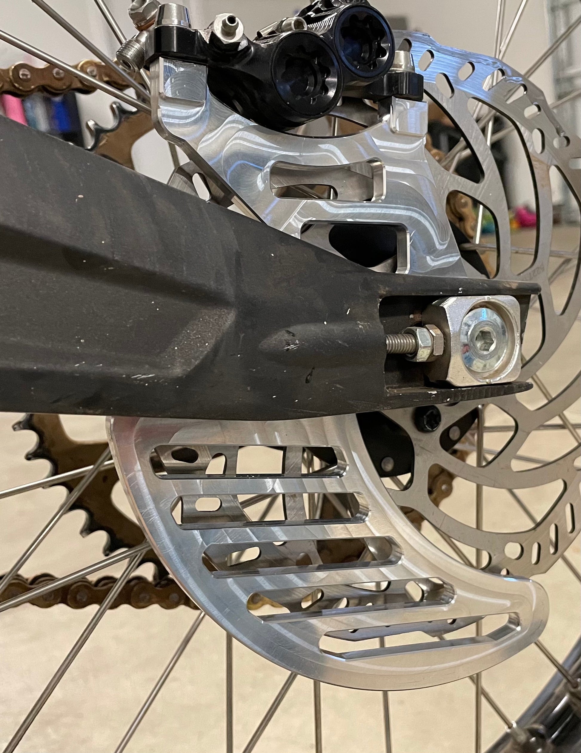 Disc guard also replaces cast aluminum caliper mount. Direct bolt on.