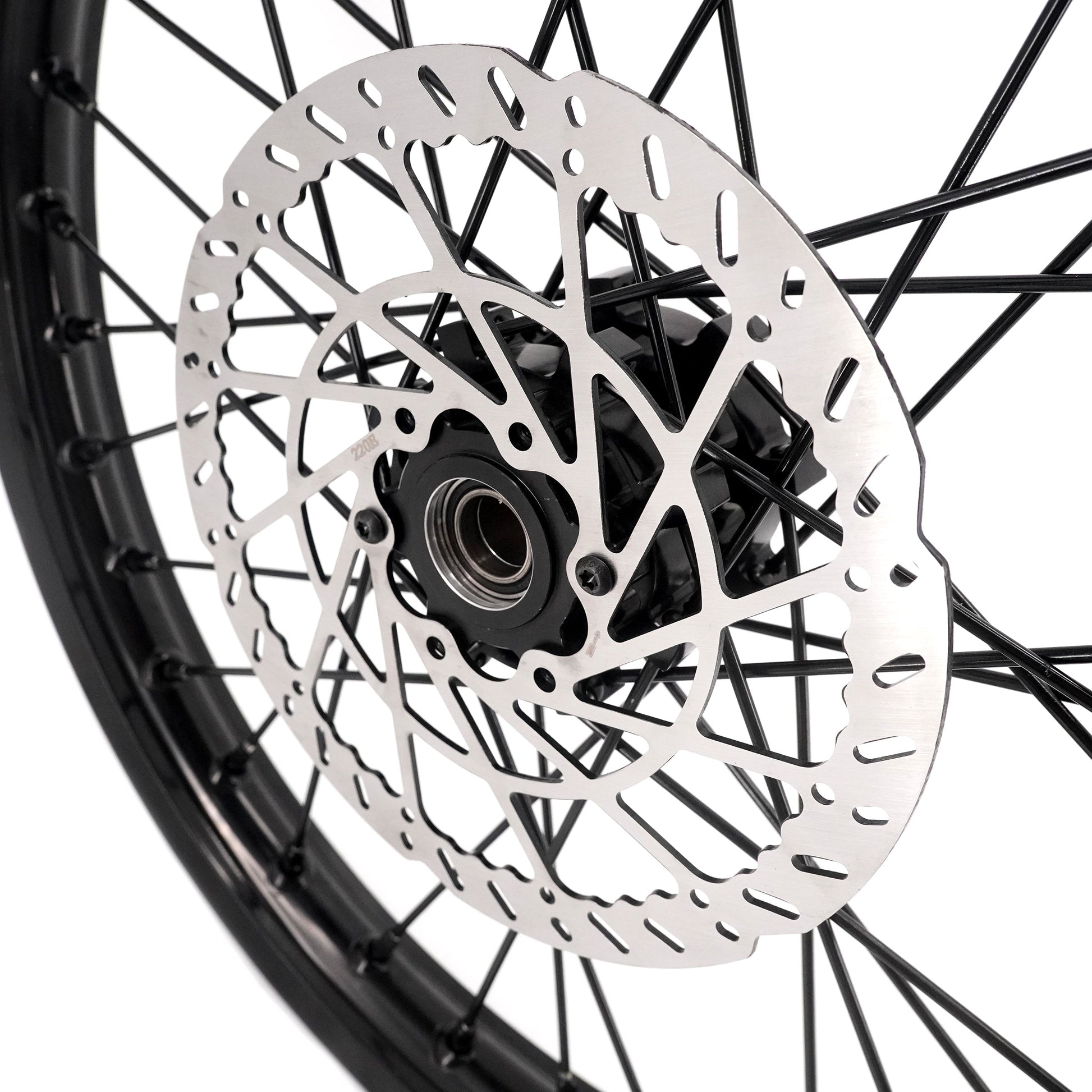 The front hub center bore has been enlarged to increase structural strength and stability under braking. On the rear wheel, the spoke hole diameter is upgraded to 3.6mm, improving durability and spoke life over time. These changes also improve braking performance, which is why the front wheel does not work with the stock SurRon front disc. To make installation straightforward, a 220mm front brake disc with bolts and a silver adapter is included at no extra cost. The OEM Talaria MX5 front disc also fits this setup perfectly.